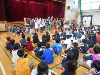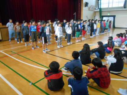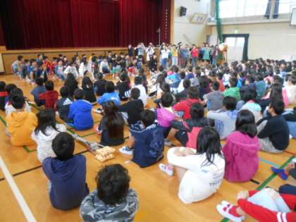 今朝の児童集会は、音読発表会をしました。4年生が、詩を2作品を群読しました。まどみちお作「よかったなあ」、北原白秋作「まつりだ わっしょい」を4年生全員が、息の合ったところを披露しました。とても元気で迫力があった発表でした。