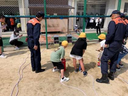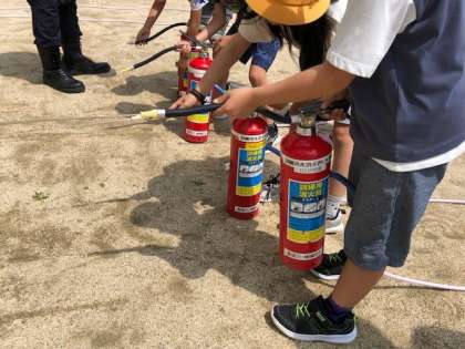 5時間目、水消火器体験をしました。実際に消火器を使うことはできませんが、小学生でも扱える水消火器の使い方を教えていただきました。絵で描かれた炎をめがけて水を勢いよくかけました。