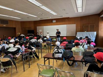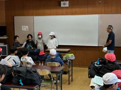 宿舎に到着しました。荷物をもって会議室へ向かい、そこで、開舎式を行いました。係りの方から説明を聞いたあと、お世話になる方々へ向けて子どもたちが挨拶をしっかり行いました。