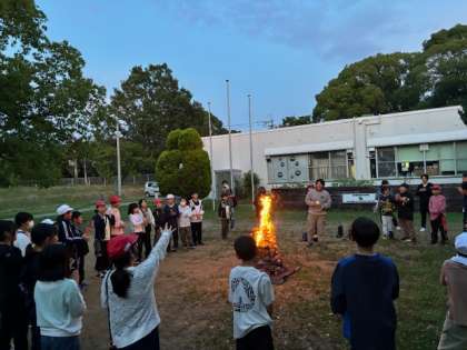 夕食後、宵闇が迫るなか、キャンプファイヤーが始まりました。リーダーさんが色々なゲームを用意してくれていて、みんなもノリノリです。楽しいひと時を過ごすことができました。