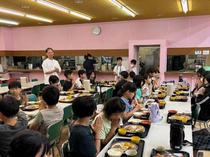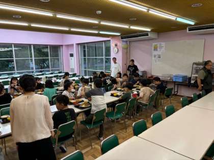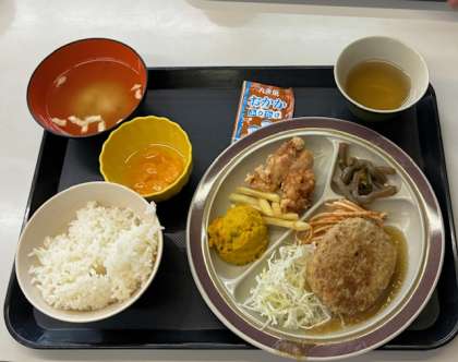 お待ちかねの夕食の時間です。メニューはハンバーグとからあげを主菜に子どもたちの好きそうなものが並びました。ごはんとお味噌汁をお代わりする児童が多数いました。