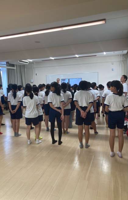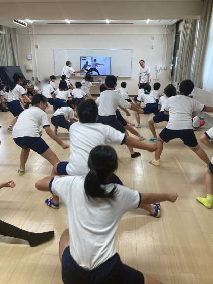 運動会では5年生と6年生が合同で団体演技を行います。今日は2学年が一緒に動画を見ながら練習に取り組みました。細かい動きも確認しながら練習しました。