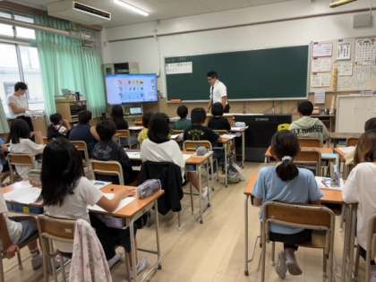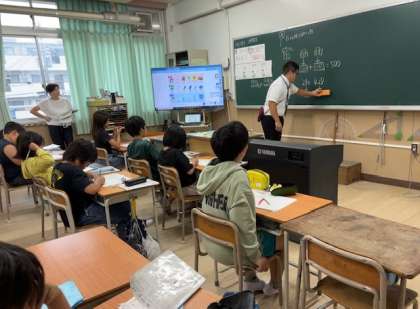 4年生の算数の授業では、先月より本校に来ている教育実習の先生が登壇しました。四捨五入、切り上げと切り捨てといった考え方を確認したうえで、どのような場面で活用するとよいかを考えていきました。