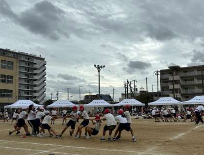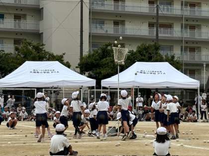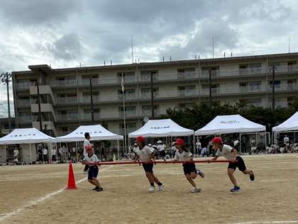 2学年ごとでの団体競技です。低学年は「玉入れ」、中学年は「台風の目(ぐるぐるハリケーン)」、高学年は「ミニつなひき」に取り組みました。