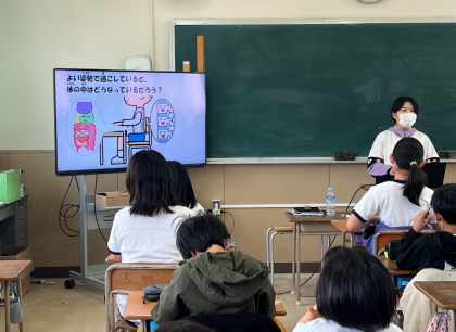 良い姿勢で過ごす大切さについて村瀬先生からお話がありました。姿勢が悪いとどうなるのか考えて聞いていました。授業中だけでなく普段の生活から姿勢を正して健康に過ごせるようにしましょう。