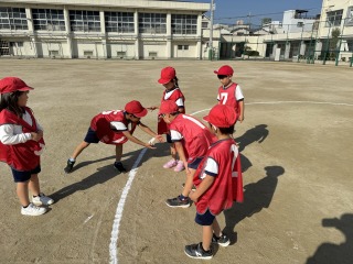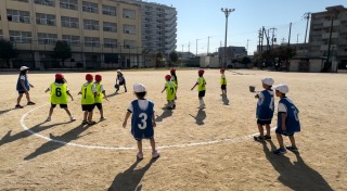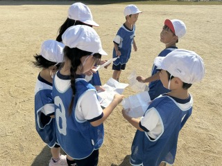 今日は各チームで作戦会議をして試合に臨みました。「投げる前にぐるぐる回ろう」「誰がボールもっているか声掛けしよう」と、それぞれ作戦をたてて頑張りました。