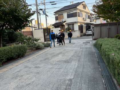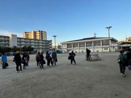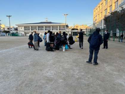 さわやかな朝、晴天のもと、子どもたちが大きな荷物を持って登校してきました。