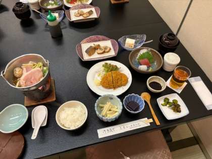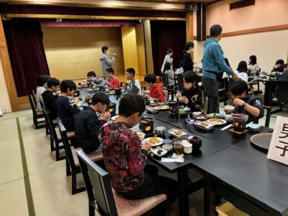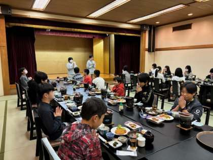 お待ちかねの夕食の時間です。児童代表の「いただきます」の声とともに、みんなの箸が動き出しました。おいしそうに食べています。