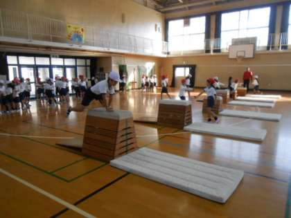2年生は、体育で「なわとび」と「跳び箱」の運動遊びに取り組んでいます。3段から6段までの跳び箱を自分の力に合わせて選んで跳びました。