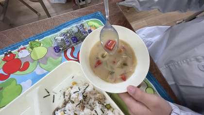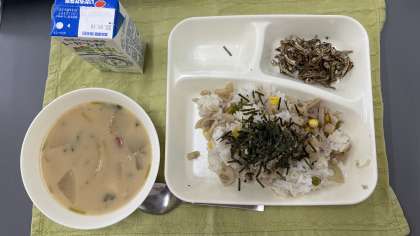 今日の給食はお正月献立として、お雑煮やちらし寿司、ごまめが出されました。2年生の教室でも、お雑煮に入っているにんじんの色を見て、「いつものにんじんと色が違う!」と声があがっていました。みんなで、お正月料理ならではの特別な食材を楽しみました。