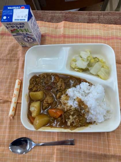 今日の給食は、豚肉と金時豆のカレーライスでした。教室では「やったーカレーだ!」と声があがっていました。皆しっかりと食べていました。