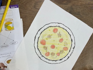 今日の外国語活動は、「What do you want?」を使ってピザ作りをしました。みんな自分が食べたいものをオーダーして、美味しそうなピザを作っていました。