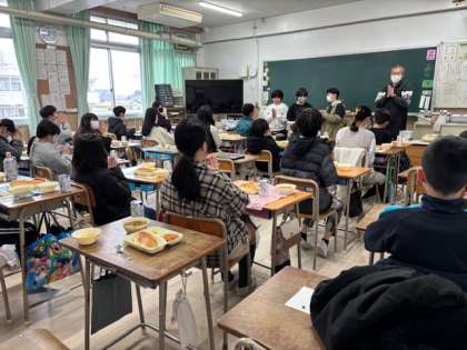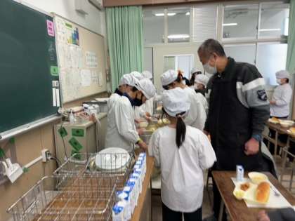 今日の給食は卒業祝い献立です。メニューは、あげどりのバーベキューソース、カレースープ、キャベツとコーンのサラダ、フルーツゼリー、おさつパン、牛乳です。6年生の教室では「おいしい」との声があがっていました。