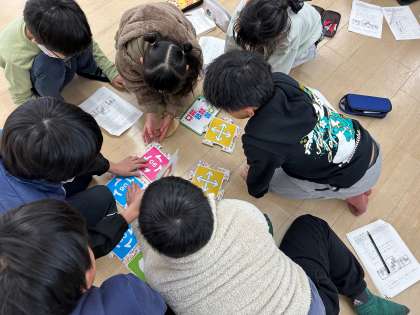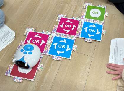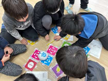 「アリロ」というてんとう虫型のロボットを使って、プログラミングの学習をしました。自分たちがパネルでプログラミングした道を、アリロが正しく進んでいくかを確かめます。