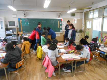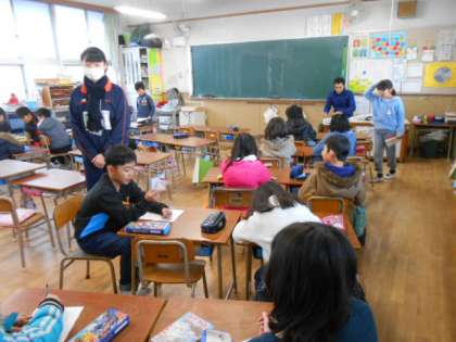 今日の1時間目、全校児童が班ごとに各教室に集まって、30日(土)に行う大隅東フェスティバルの準備をしました。職業体験2日目の中学生も児童と一緒に活動し、優しくアドバイスをしてくれました。中学生の4人は、2日間を小学校で過ごし、「楽しかった。」「かわいかった。」と自分自身の小学校時代を思い浮かべながら感想を述べてくれました。2日間、ご苦労様でした。