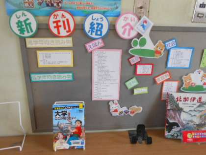 図書ボランティアと図書館支援員の方々が、学校図書館をよりよく利用できるように環境整理をしてくださっています。「図書館の使い方」や図書館ニュースを掲示したり、新しい本の紹介したり様々な工夫をしていただいています。