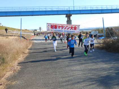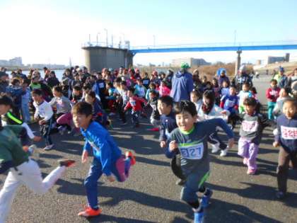 午前9時開会式のあと、ラジオ体操で準備運動をして、低学年(3km)、高学年・一般(5km)の順でスタートしました。この冬でもっと強い寒波到来の中で、子どもたちは元気にスタートしていきました。