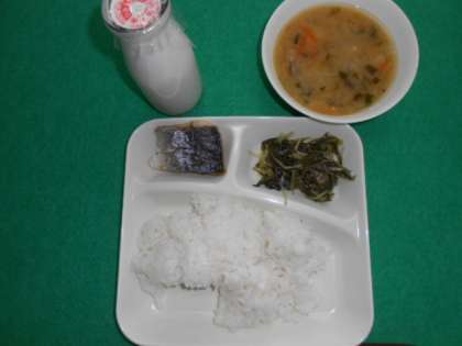 本日26日(火)の給食献立は、さごしのしょうゆだれかけ、みそ汁、みずなの煮びたし、米飯、牛乳でした。