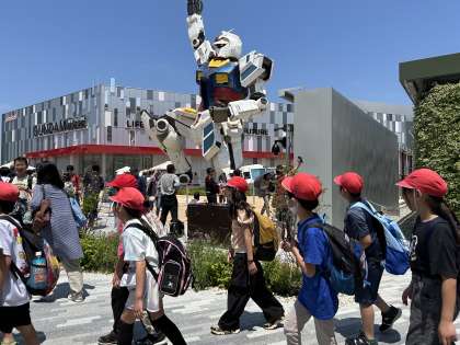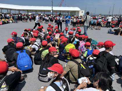 今日は、3年生と4年生が校外学習として大阪・関西万博にでかけました。昨日に引き続き、今日もたくさんの人でにぎわっていました。入場を待つ間に、入場券を配ってもらい、さあ、出発です!
