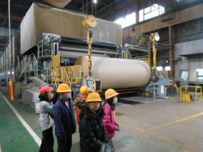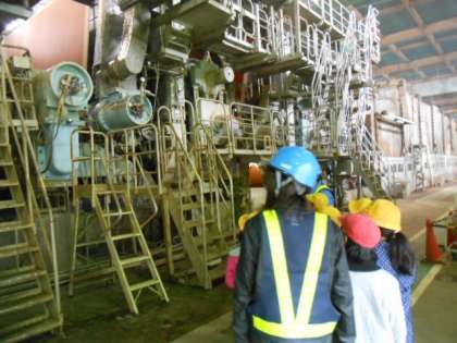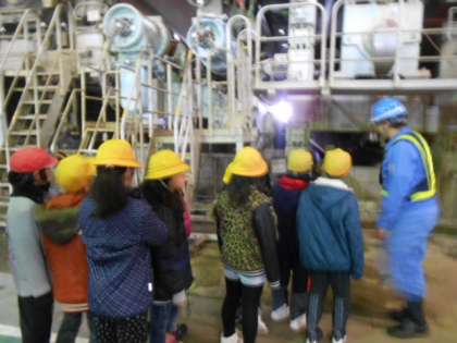 古紙が、パルパーという機械で離解された後、不純物を取り除き、ワイヤーパート、プレスパート、ドライヤーパートという大きな機械で順に成型され大きなロール製品ができあがる様子を見学させていただきました。児童たちは、日常生活で不要になった紙が、工場でたくさんの人と様々な機械の働きで再生されていく様子を間近に見て、たくさんのことを学び取って学校に帰ってきました。、