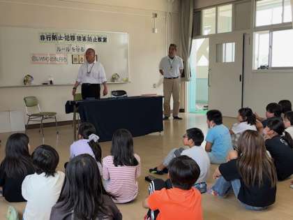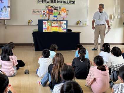 少年サポートセンターや警察署から出前授業に来てくださいました。一人一人が社会のルールを守ることや、人形劇を通して万引きは絶対にするべきでないことなどを分かりやすく教えていただきました。