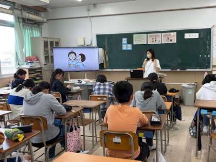 水泳活動が始まる前に、養護教諭が「自分や他の人の体を大切にするためにできることを考えよう」という主旨で授業を行いました。「体の距離感」と「心の距離感」などに関し理解を深めました。