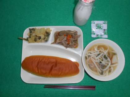 今日の給食献立は、豚肉とごぼうの煮もの、なにわうどん、キャベツと三度豆のごま和え、パンプキンパン、牛乳です。