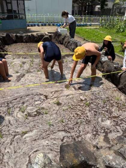 待ちに待った田植えをしました。一人4つずつ苗を持って、田んぼの土の中に植えていきました。昔の人は、大変な作業をしてお米を作っていたんだなと感じたり、楽しく作業したりすることができました。秋には、豊作となることを願っています。