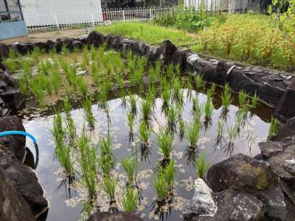 先月、学習園の特設田んぼに、5年生が植えた稲の様子です。今日午後の突然の夕立のおかげで、たっぷりと水をたたえた田んぼにしっかりと根をはって立っています。暑さに負けずスクスクと育ってほしいものです。