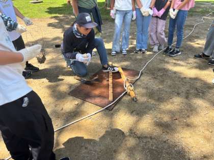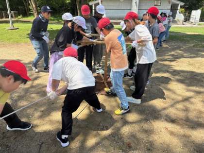 カレーづくりのスタートです。最初に調理のための火起こしをしました。みんなで力を合わせて、器具を引っ張り、摩擦の作用で見事に炎があがりました。