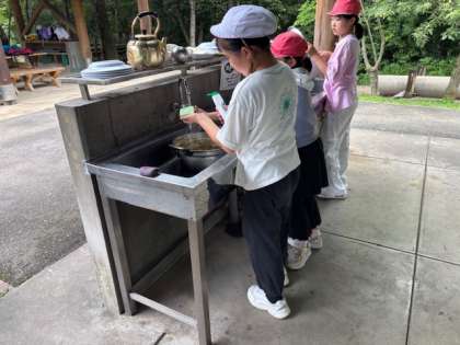カレーを食べ終わり、後片付けをしました。協力して頑張ったことで、鍋や食器がキレイになりました。その後、広場で集合写真を撮りました。