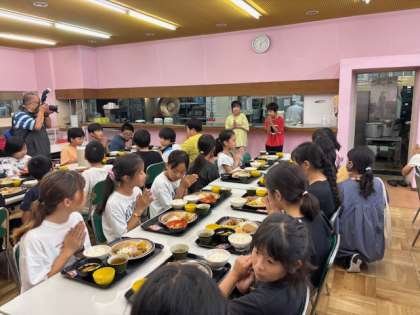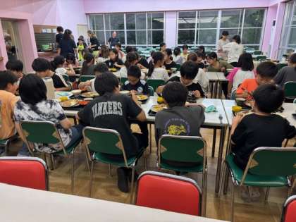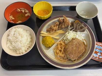 お待ちかねの夕食の時間です。メニューはハンバーグとからあげを主菜に子どもたちの好きそうなものが並びました。ごはんとお味噌汁をお代わりする児童が多数いました。