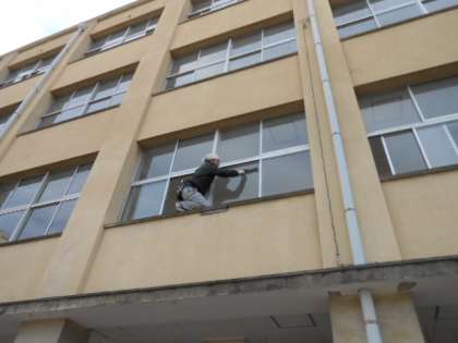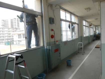卒業式、入学式をひと月後に控え、校舎の2階以上の高所窓を専門業者に清掃していただきました。