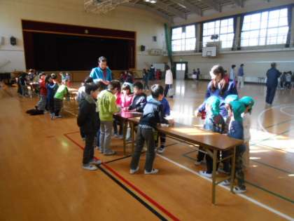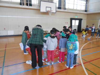 昨日、南江口保育所と1・2の交流会をしました。本校の2年生が中心になって、、様々な遊び(風船ロケット、魚つり、ぴょんぴょんがえる、トコトコぐるま、フリスビー、ウィングカー、山を登るかめ など)コーナーを準備して、保育園児と1年生が、一緒に楽しく活動しました。