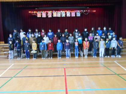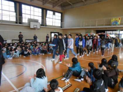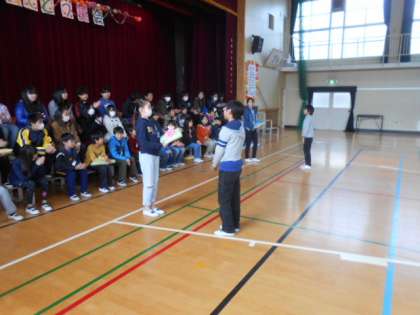 2時間目、体育館に全校児童が集まって、「卒業おめでとう集会」をしました。児童会代表委員の司会でプログラム「在校生からの贈り物」が1年から順に進行しました。