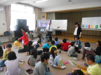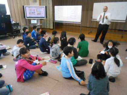 毎週水曜日、C−NETのエリック先生と一緒に5,6年生の英語教室があります。英語であいさつをしたり、英語で誕生日月を習いました。子ども達は、とても楽しい雰囲気で英語に親しんでいます。