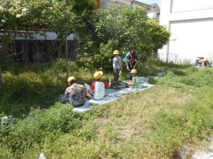 2年生は、学習園で「春みつけ」の単元で、モンシロチョウやカラスノエンドウを学習カードに記録をしていました。
