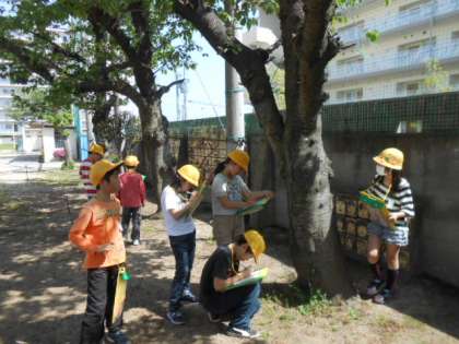 また、6年生は、「春の生き物」の単元で桜の木を細かく観察し学習カードにまとめていました。