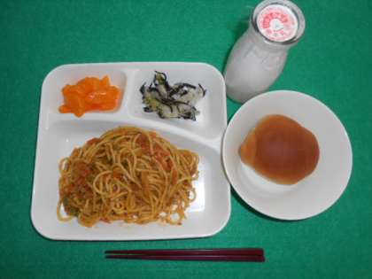 今日の給食献立は、カレースパゲッティー、キャベツのひじきドレッシング、みかん、ロールパン、牛乳でした。6日(金)は、こどもの日の行事献立です。児童の皆さん、楽しみにしていてください。