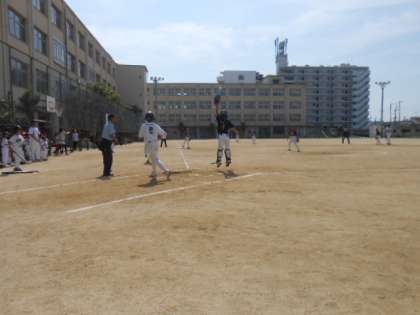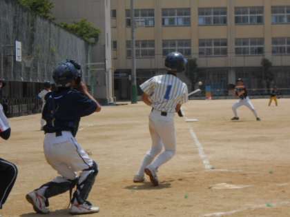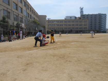 出場チームは、合同A(第一、第三、第四、市営南江口)と合同B(第六、瑞光荘園、南一荘園)と江口の3チームで、総当たりのリーグ戦です。低学年と女子には、スローピッチを採用し、技能差があっても楽しめるようにルールが工夫されています。