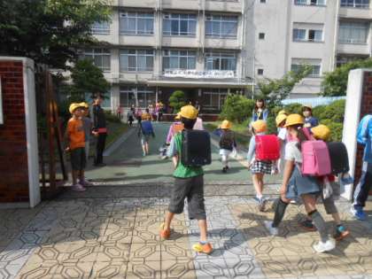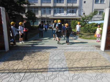 児童会の代表が、毎朝集団登校してくる全児童に、元気よく「おはようございます。」とよびかけてくれています。あいさつの声が小さかった児童も大きな声で元気に、あいさつを交わしています。これからも、あいさつの輪を広げていきます。