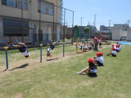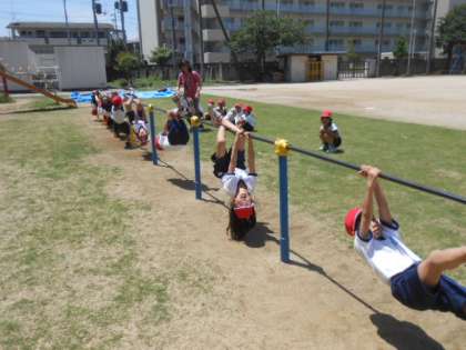 1年生が、体育の学習で鉄棒遊びを楽しみました。つばめのように鉄棒に腕支持して乗ったり、ぶら下がって「ぶたのまるやき」に挑戦したりしていました。