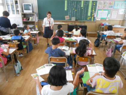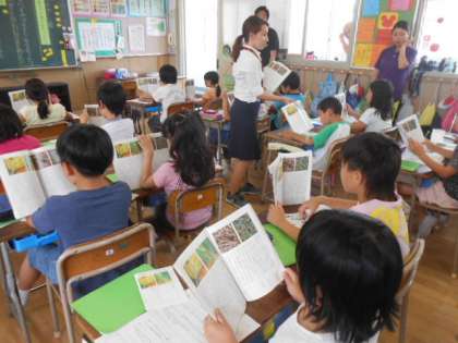「3年2組生き物のふしぎ事典」をつくろうの学習で、説明文教材「自然のかくし絵」を読み取る授業を参観し、その指導について教職員が研修しました。