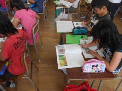 児童は、昆虫が敵から身をかくす様子に関心を持って、読み取ったことを短くまとめる課題に取り組みました。