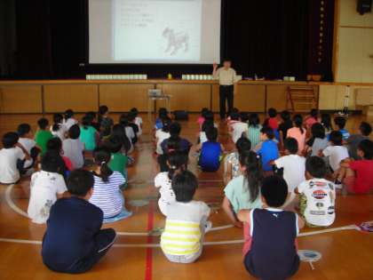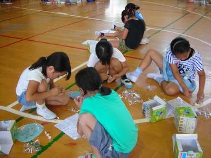 ムーッとした講堂に集合し、映像により、ロボットの歴史とともに科学の進歩のすばらしさについての話の後、ウインドウォーカー(風力歩行ロボット)を熱心に作っていました。少し難しかったようですが、粘り強く取り組んでいました。終了後、金田教授からすごく授業中の態度が良く、しっかり話を聞いてもらえてとてもうれしかったとおっしゃられていました。