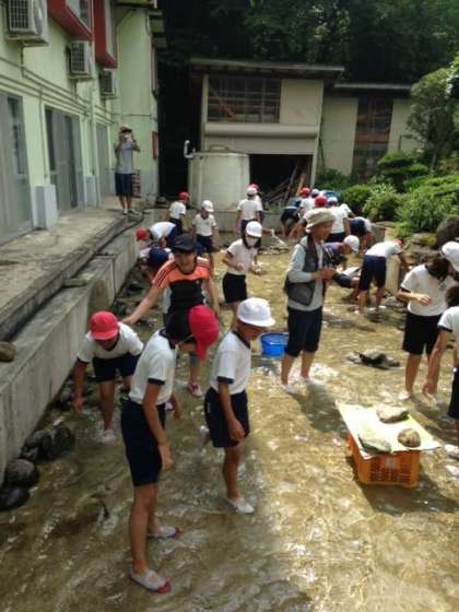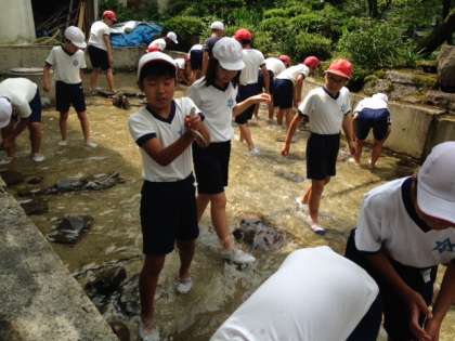 午後の活動前半、1組魚つかみ2組焼き板の様子です。「魚がぬるぬるやぁ!」と騒ぎながら追いかけています。