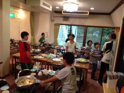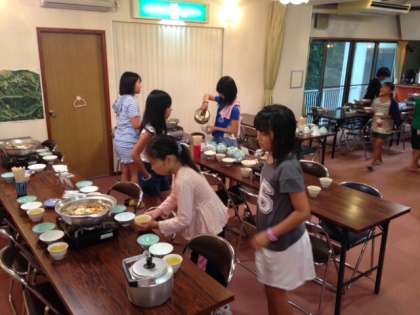 林間学習の活動は、班を中心に協力して行います。食事係が準備、片付けをリードして頑張りました。