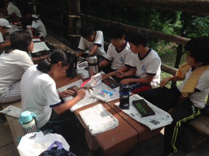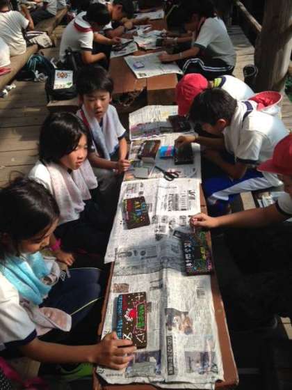 焼き板の絵付けをしました。昨日磨いた板に専用の絵の具6色(赤青黄緑黒白)でカラフルな図柄を描きました。どの作品も個性豊かな表現です。