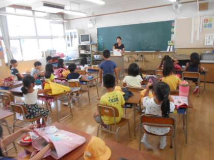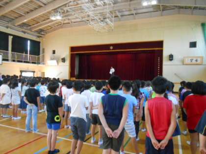 いよいよ今日から2学期がスタートです。8時10分に校門を開門して8時15分までには、全校児童のほとんどが登校していました。子ども達が、今日を楽しみに待っていたことが伺えました。9時から体育館で2学期の始業式をしました。その後、学級に戻って、後期の教科書を教室で受け取ったり、夏休みの楽しかったことなどの思い出を発表し合いました。