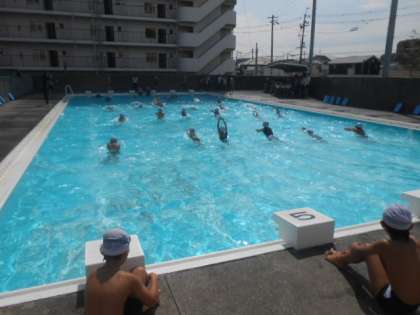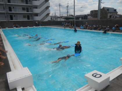 プールの横(11m)を伏し浮、け伸び、バタ足で何度も往復しました。また、縦(25m)を4拍子のリズムに合わせて泳いだり、手足のコンビネーションと息継ぎを意識したクロールで泳いだりしているところを参観していただきました。
